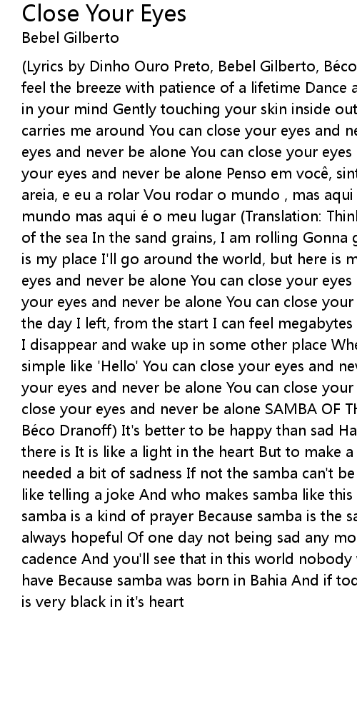 | Lyrics by Dinho Ouro Preto, Bebel Gilberto, Be co Dranoff You know you can feel the breeze with patience of a lifetime Dance above the trees to the rhythm in your mind Gently touching your skin inside out Floating on the seas, it carries me around You can close your eyes and never be alone You can close your eyes and never be alone You can close your eyes and never be alone You can close your eyes and never be alone Penso em voc, sinto um gosto de mar Nos gr os de areia, e eu a rolar Vou rodar o mundo , mas aqui e o meu lugar Eu vou rodar o mundo mas aqui e o meu lugar Translation: Thinking about you, I feel the taste of the sea In the sand grains, I am rolling Gonna go around the world, but here is my place I' ll go around the world, but here is my place You can close your eyes and never be alone You can close your eyes and never be alone You can close your eyes and never be alone You can close your eyes and never be alone Since the day I left, from the start I can feel megabytes of memories in my heart Wish I disappear and wake up in some other place Where there' s no pain or fear, is simple like ' Hello' You can close your eyes and never be alone You can close your eyes and never be alone You can close your eyes and never be alone You can close your eyes and never be alone SAMBA OF THE BLESSING Literal translation by Be co Dranoff It' s better to be happy than sad Happiness is the best thing there is It is like a light in the heart But to make a samba with beauty It' s needed a bit of sadness If not the samba can' t be made To make a samba is not like telling a joke And who makes samba like this is worth nothing The good samba is a kind of prayer Because samba is the sadness that sways And sadness is always hopeful Of one day not being sad any more Put a little love in the cadence And you' ll see that in this world nobody wins The beauty that a samba have Because samba was born in Bahia And if today it is white in it' s poetry It is very black in it' s heart |