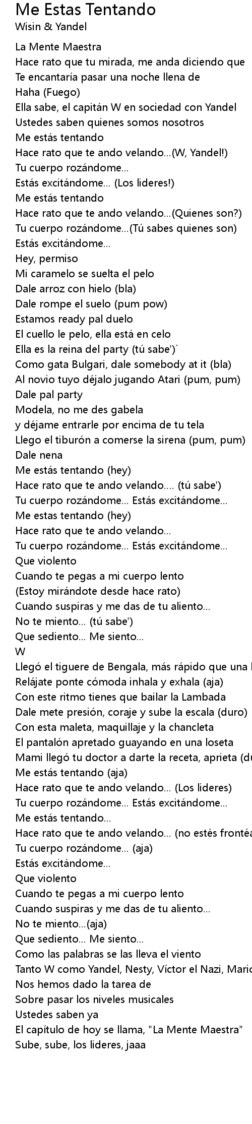 | [00:20.26] | Hace rato que te ando velando... W, Yandel! |