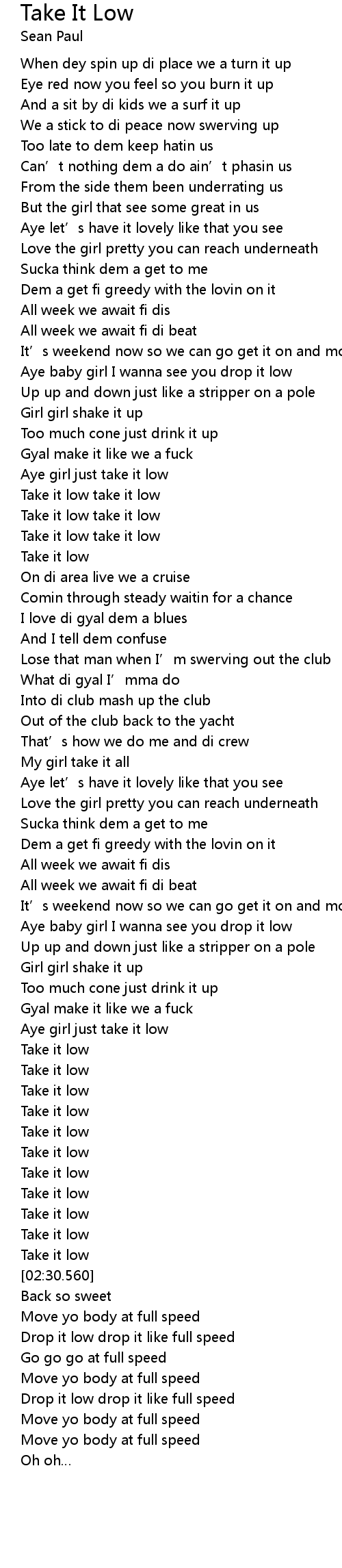 | [02:36.450] | Drop it low drop it like full speed |