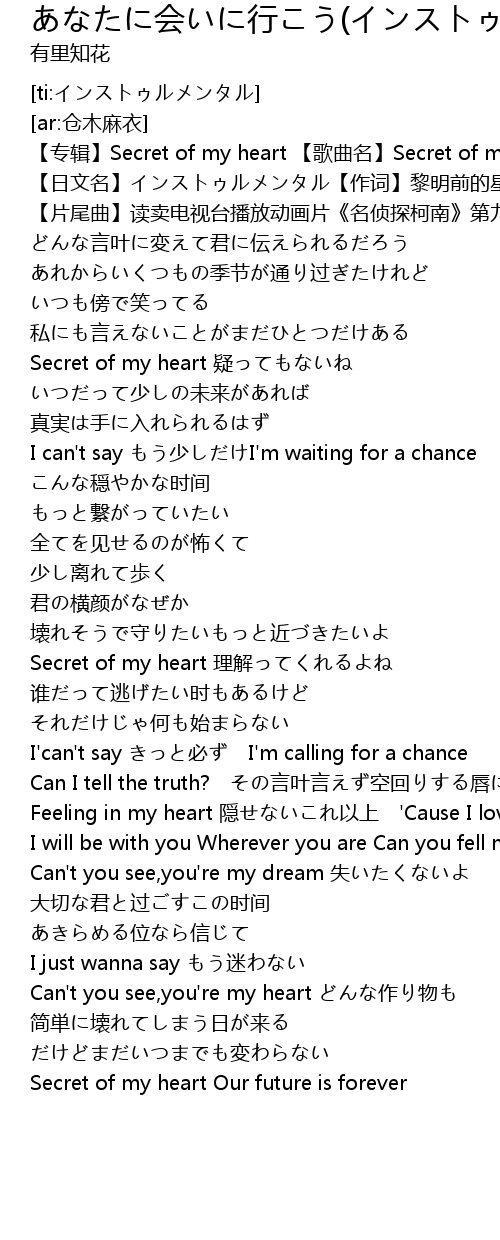 | [00:02.855] | 【专辑】Secret of my heart 【歌曲名】Secret of my heart |