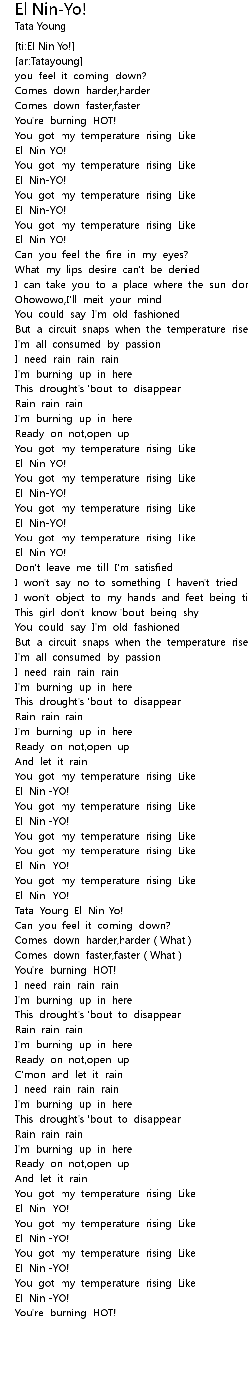 | [02:09.368] | You got my temperature rising Like |