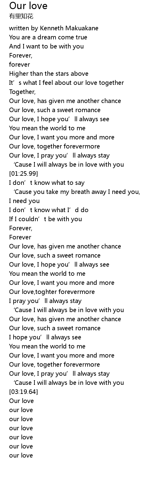 | [01:14.37] | Our love, I pray you’ll always stay |