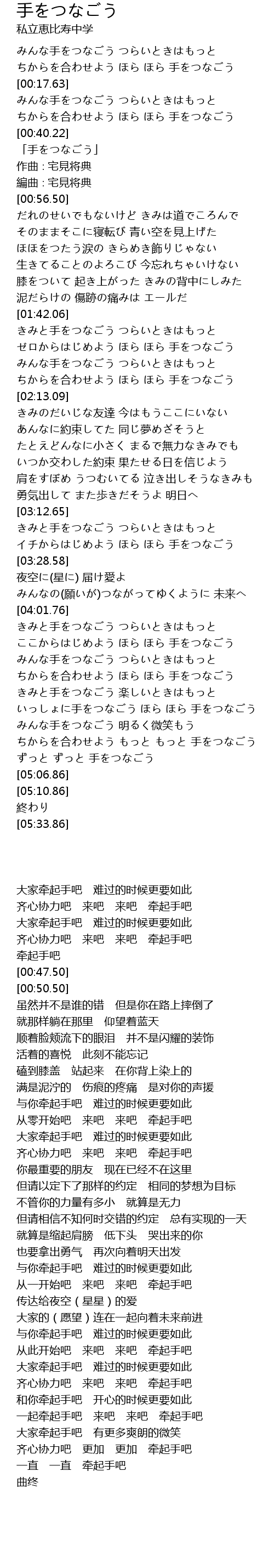 | [04:17.59] | みんな手をつなごう つらいときはもっと |