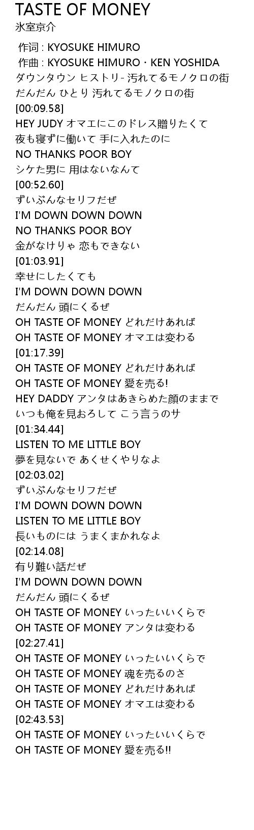| [02:39.57] | OH TASTE OF MONEY 魂を売るのさ |