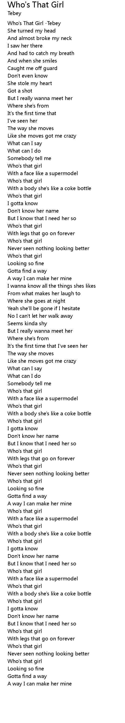 | [00:00.400] | Who's That Girl -Tebey |