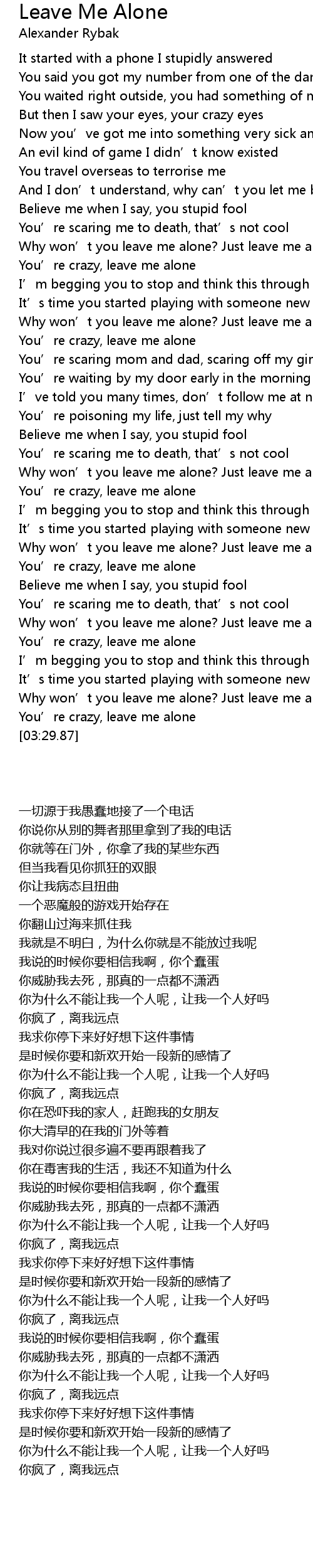 | [03:21.96] | Why won' t you leave me alone? Just leave me alone |