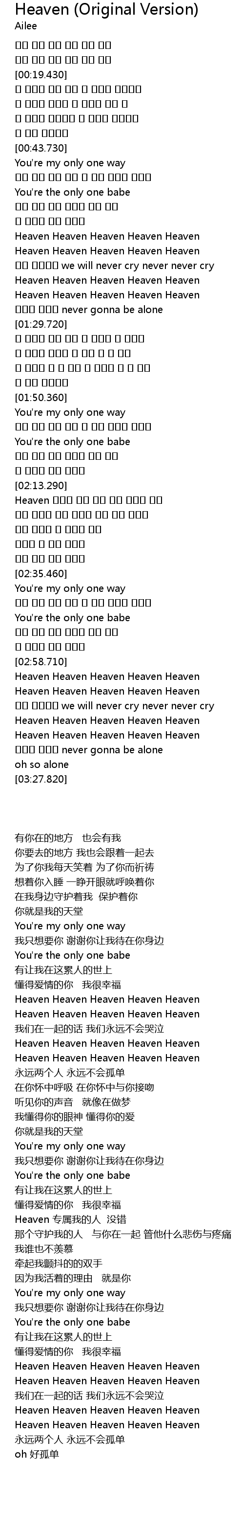 | [02:13.570] | Heaven 나만의 사람 그래 나를 지켜줄 사람 |