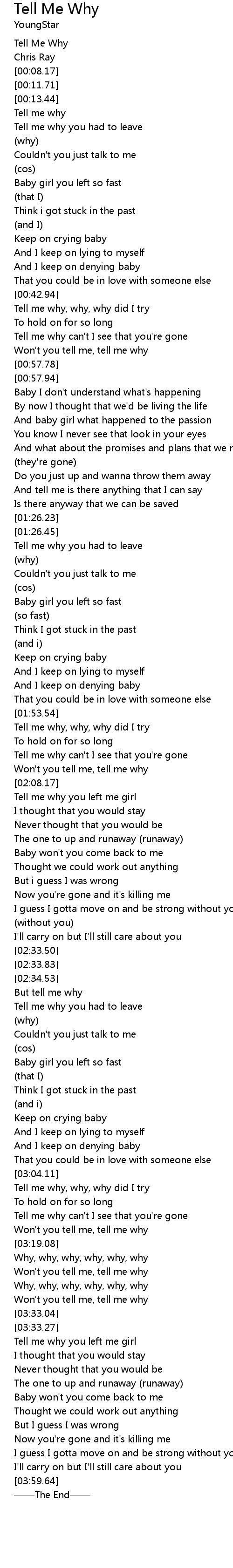 | [02:37.25] | Tell me why you had to leave |