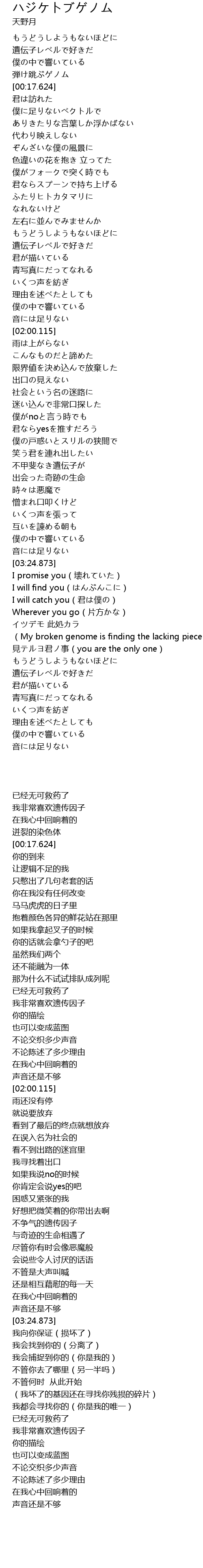 | [03:56.622] | My broken genome is finding the lacking piece |