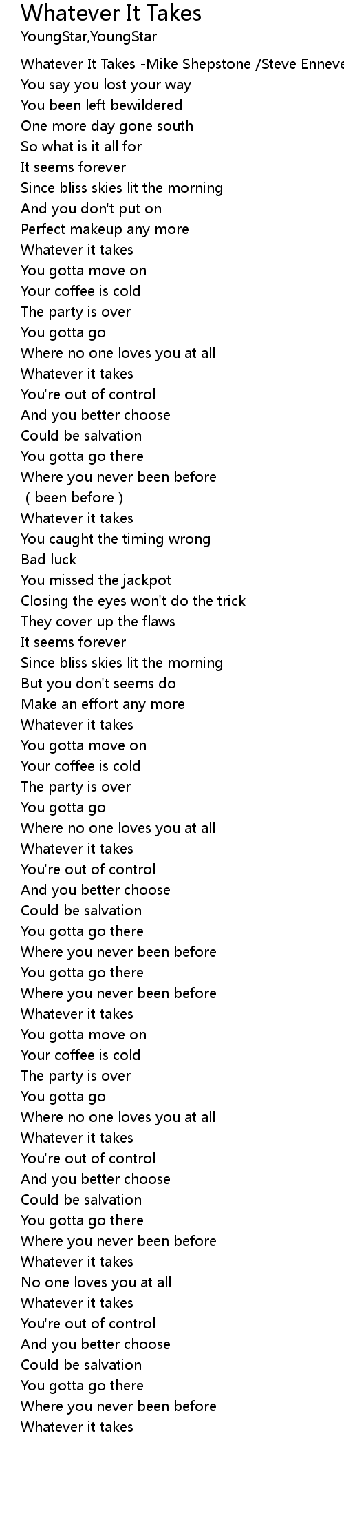 | [00:00.00] | Whatever It Takes -Mike Shepstone /Steve Ennever |