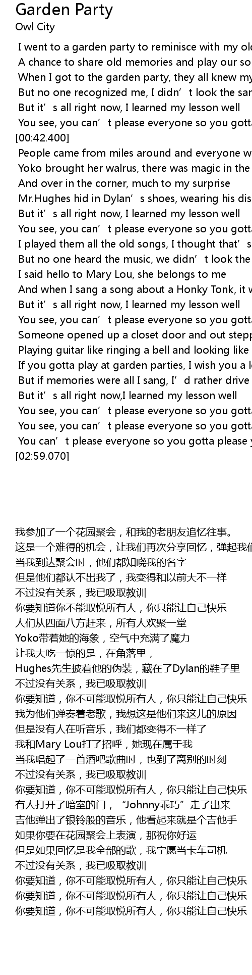 | [00:02.590] | I went to a garden party to reminisce with my old friends |