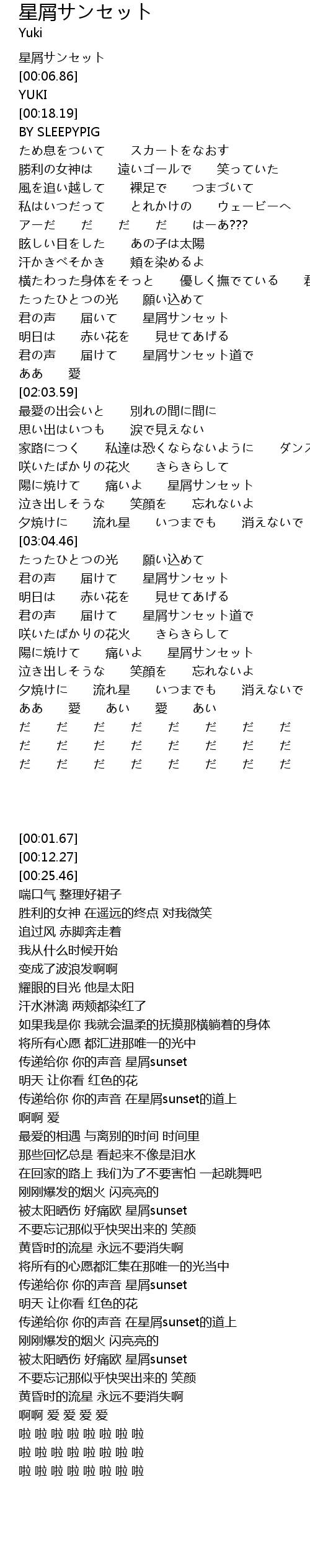 | [01:45.51] | 君の声 届けて 星屑サンセット道で |