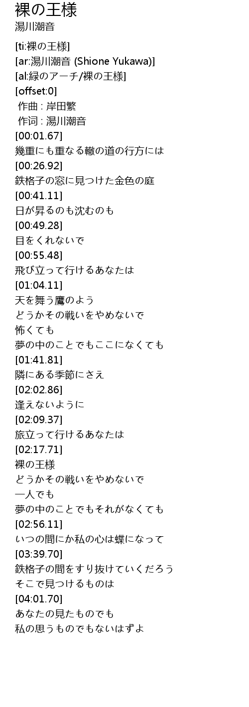 | [00:30.35] | 鉄格子の窓に見つけた金色の庭 |