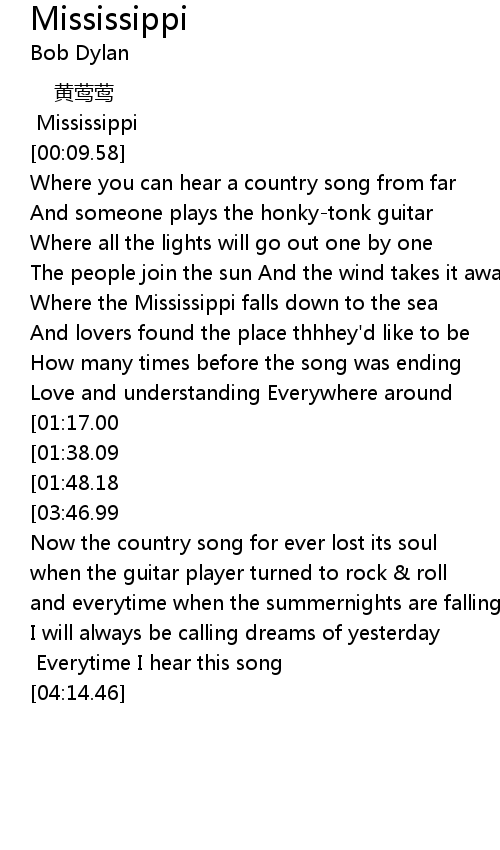 | [03:26.08][01:48.18] | Mississippi you' ll be on my mind Everytime I hear this song |