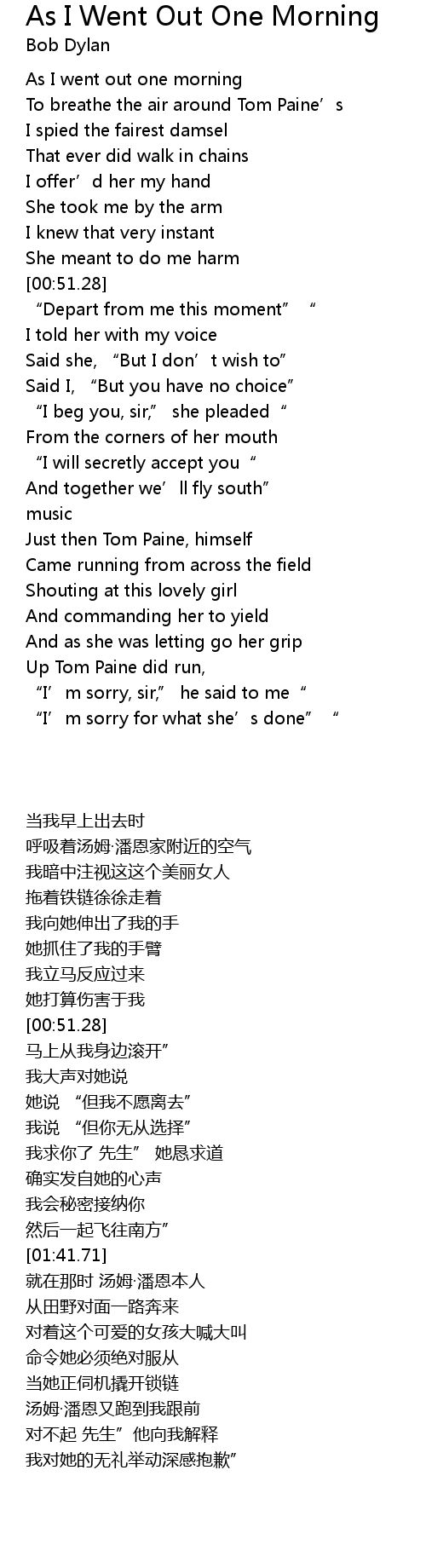 | [00:11.56] | As I went out one morning |