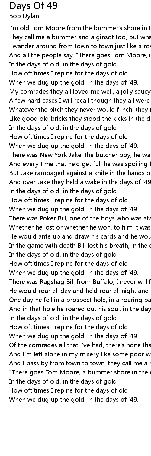 When we dug up the gold, in the days of '49. |