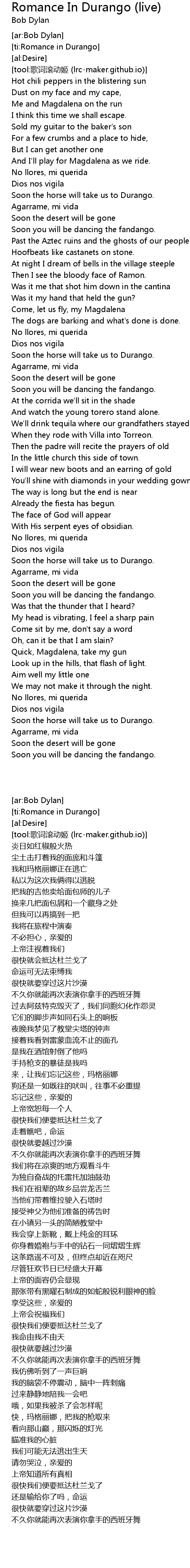 | [01:09.465] | Soon the horse will take us to Durango. |