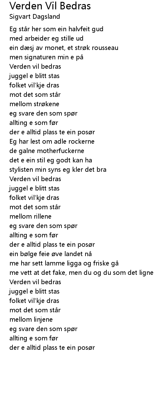 | Song | Verden Vil Bedras |