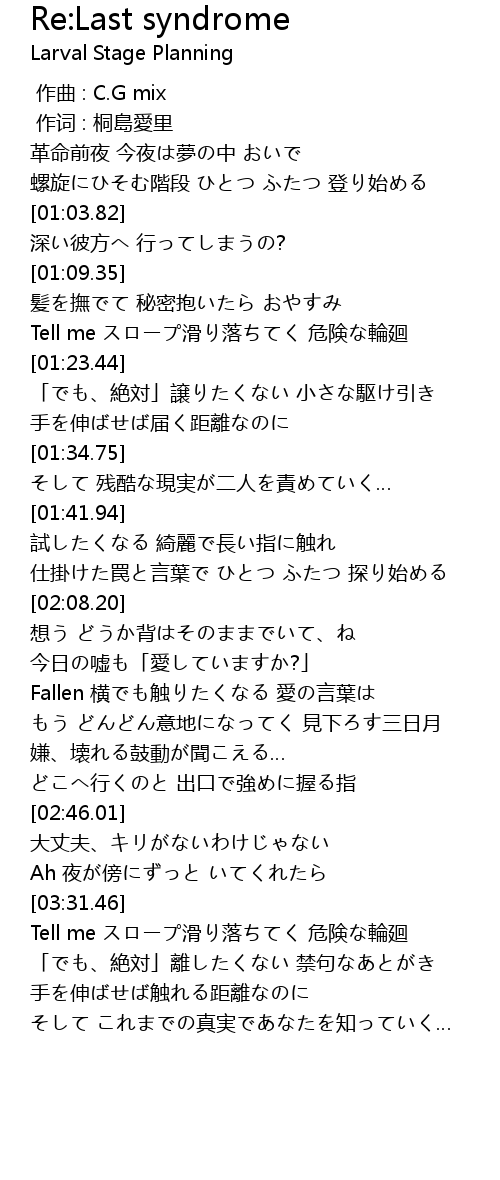 | [00:56.56] | 螺旋にひそむ階段 ひとつ ふたつ 登り始める |