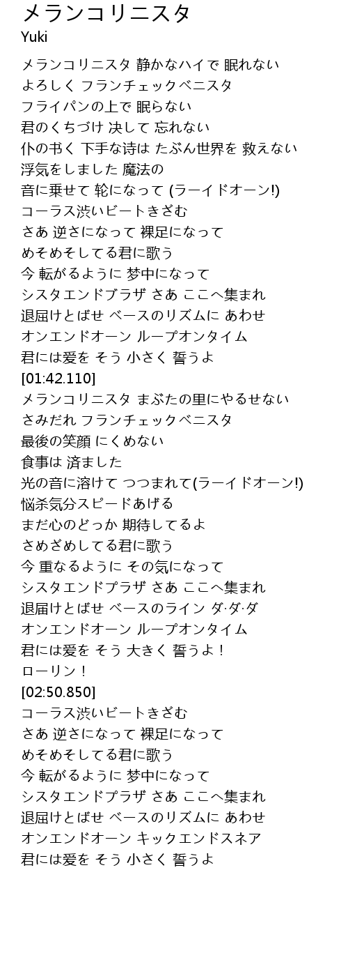 | [01:50.230] | メランコリニスタ まぶたの里にやるせない |