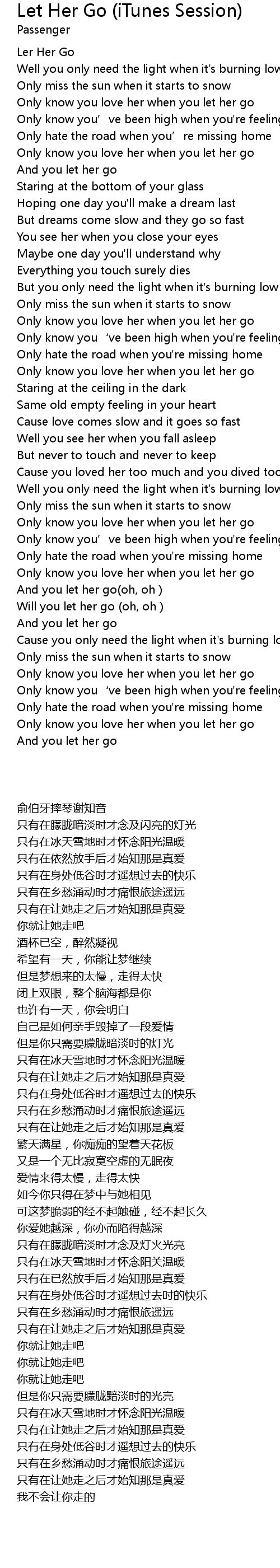 | [00:20] | Only know you love her when you let her go |