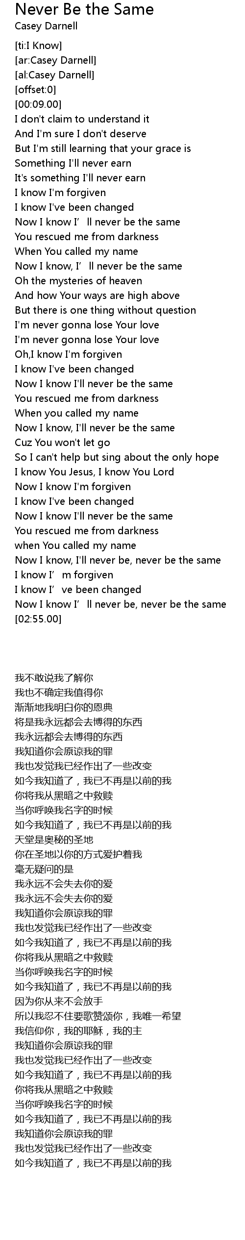 | [02:44.40] | Now I know I' ll never be, never be the same |