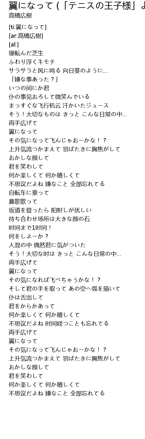 | [01:13.79] | 上升気流つかまえて 羽ばたきに胸焦がして |