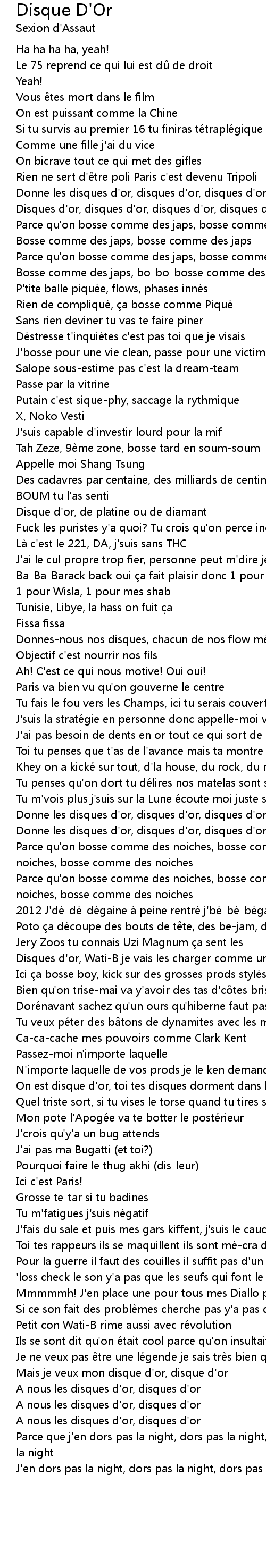 | On est disque d' or, toi tes disques dorment dans les bacs | |