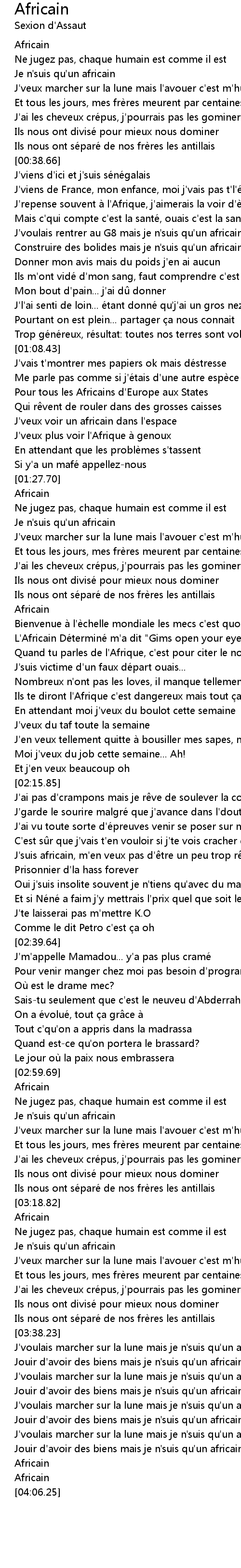 | [03:50.26] | Jouir d'avoir des biens mais je n'suis qu'un africain |