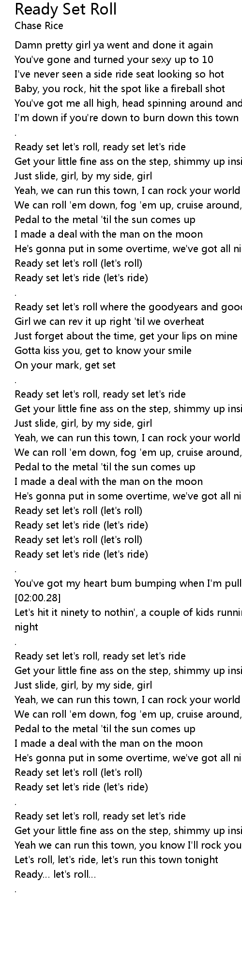 | [02:34.46] | Ready set let' s roll let' s roll |