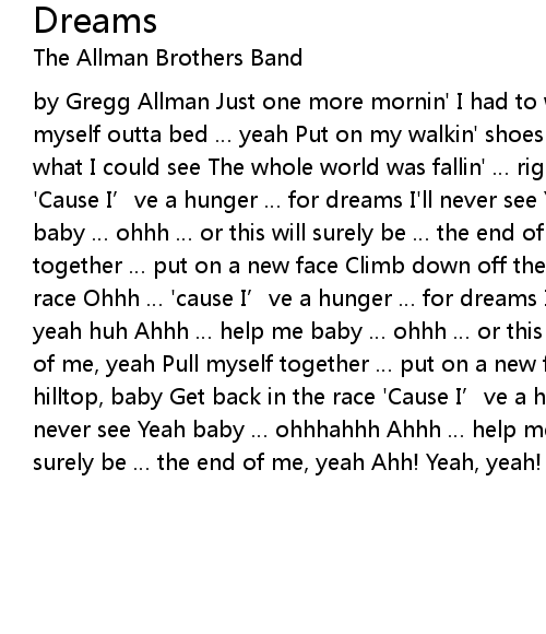 | by Gregg Allman Just one more mornin' I had to wake up with the blues Pulled myself outta bed … yeah Put on my walkin' shoes Went up on the mountain To see what I could see The whole world was fallin' … right down in front of me 'Cause I’ve a hunger … for dreams I'll never see Yeah baby Ohh-ahhh, help me baby … ohhh … or this will surely be … the end of me, yeah Pull myself together … put on a new face Climb down off the hilltop, baby Get back in the race Ohhh … 'cause I’ve a hunger … for dreams I'll never see Yeah baby … yeah huh Ahhh … help me baby … ohhh … or this will surely be … the end of me, yeah Pull myself together … put on a new face Climb down off the hilltop, baby Get back in the race 'Cause I’ve a hunger … for dreams I'll never see Yeah baby … ohhhahhh Ahhh … help me baby … ohhh … or this will surely be … the end of me, yeah Ahh! Yeah, yeah! Ohhahhh! Ohhhahh! |