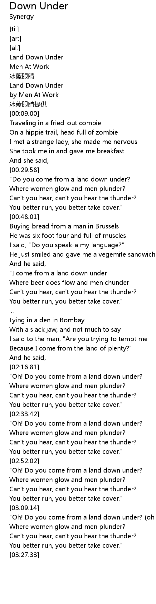 | [03:10.51] | "Oh! Do you come from a land down under? (oh yeah yeah) |