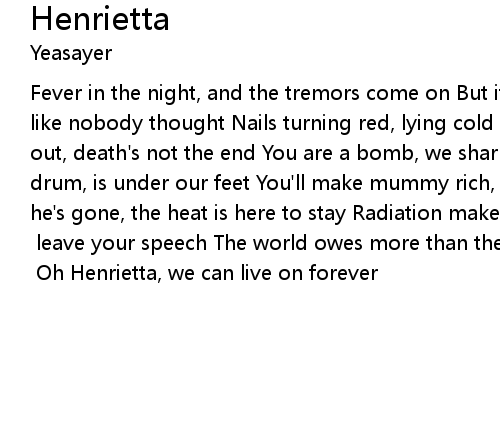 Fever in the night, and the tremors come on But it's you who'll survive, just like nobody thought Nails turning red, lying cold on the bed And now it turns out, death's not the end You are a bomb, we sharpen our teeth A magnificent drum, is under our feet You'll make mummy rich, he'll throw you away And after he's gone, the heat is here to stay Radiation makes you weak, and right okays [?] leave your speech The world owes more than they'll pay, in the whim of insane [?] Oh Henrietta, we can live on forever |
