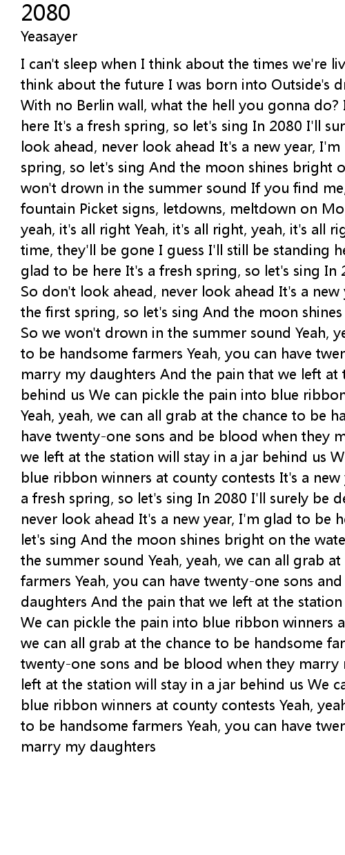 I can't sleep when I think about the times we're living in I can't sleep when I think about the future I was born into Outside's dressed up like Sunday morning With no Berlin wall, what the hell you gonna do? It's a new year, I'm glad to be here It's a fresh spring, so let's sing In 2080 I'll surely be dead So don't look ahead, never look ahead It's a new year, I'm glad to be here It's the first spring, so let's sing And the moon shines bright on the water tonight So we won't drown in the summer sound If you find me, I'll be sitting by the water fountain Picket signs, letdowns, meltdown on Monday morning But it's all right, yeah, it's all right Yeah, it's all right, yeah, it's all right 'Cause in no time, they'll be gone I guess I'll still be standing here It's a new year, I'm glad to be here It's a fresh spring, so let's sing In 2080 I'll surely be dead So don't look ahead, never look ahead It's a new year, I'm glad to be here It's the first spring, so let's sing And the moon shines bright on the water tonight So we won't drown in the summer sound Yeah, yeah, we can all grab at the chance to be handsome farmers Yeah, you can have twenty-one sons and be blood when they marry my daughters And the pain that we left at the station will stay in a jar behind us We can pickle the pain into blue ribbon winners at county contests Yeah, yeah, we can all grab at the chance to be handsome farmers Yeah, you can have twenty-one sons and be blood when they marry my daughters And the pain that we left at the station will stay in a jar behind us We can pickle the pain into blue ribbon winners at county contests It's a new year, I'm glad to be here It's a fresh spring, so let's sing In 2080 I'll surely be dead So don't look ahead, never look ahead It's a new year, I'm glad to be here It's the first spring, so let's sing And the moon shines bright on the water tonight So we won't drown in the summer sound Yeah, yeah, we can all grab at the chance to be handsome farmers Yeah, you can have twenty-one sons and be blood when they marry my daughters And the pain that we left at the station will stay in a jar behind us We can pickle the pain into blue ribbon winners at county contests Yeah, yeah, we can all grab at the chance to be handsome farmers Yeah, you can have twenty-one sons and be blood when they marry my daughters And the pain that we left at the station will stay in a jar behind us We can pickle the pain into blue ribbon winners at county contests Yeah, yeah, we can all grab at the chance to be handsome farmers Yeah, you can have twenty-one sons and be blood when they marry my daughters