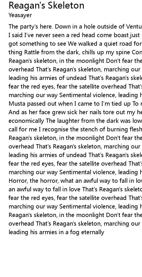 The party's here. Down in a hole outside of Ventura Lo and behold, found beauty I said I've never seen a red head come boast just like that She said outside, got something to see We walked a quiet road for miles at first Couldn't see a thing Rattle from the dark, chills up my spine Coming from the trees oh That's Reagan's skeleton, in the moonlight Don't fear the red eyes, fear the satellite overhead That's Reagan's skeleton, marching our way Sentimental violence, leading his armies of undead That's Reagan's skeleton, in the moonlight Don't fear the red eyes, fear the satellite overhead That's Reagan's skeleton, marching our way Sentimental violence, leading his armies in a fog eternally Musta passed out when I came to I'm tied up To my surprise, by the young lady And as her face grew sick her nails tore out my heart Blood trickled down, economically The laughter from the dark was low at first But what came could call for me I recognise the stench of burning flesh As they began to feed oh On Reagan's skeleton, in the moonlight Don't fear the red eyes, fear the satellite overhead That's Reagan's skeleton, marching our way Sentimental violence, leading his armies of undead That's Reagan's skeleton, in the moonlight Don't fear the red eyes, fear the satellite overhead That's Reagan's skeleton, marching our way Sentimental violence, leading his armies in a fog eternally Horror, the horror, what an awful way to fall in love Horror, the horror, what an awful way to fall in love That's Reagan's skeleton, in the moonlight Don't fear the red eyes, fear the satellite overhead That's Reagan's skeleton, marching our way Sentimental violence, leading his armies of undead That's Reagan's skeleton, in the moonlight Don't fear the red eyes, fear the satellite overhead That's Reagan's skeleton, marching our way Sentimental violence, leading his armies in a fog eternally |