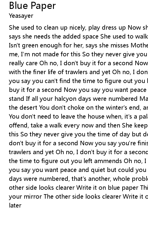 She used to clean up nicely, play dress up Now she's throwing her clothes away, says she needs the added space She used to walk on concrete, now the sidewalk Isn't green enough for her, says she misses Mother Earth She keeps on telling me, I'm not made for this So they never give you the time of day but do you really care Oh no, I don't buy it for a second Now you say you're finished up with the finer life of trawlers and yet Oh no, I don't buy it for a second Now you say you can't find the time to figure out you left ammends Oh no, I don't buy it for a second Now you say you want peace and quiet but could you really stand If all your halcyon days were numbered Make a move become tax exiles, in the desert You don't choke on the winter's end, and the sky isn't hidden there You don't need to leave the house when, it's a palace And there's no one to offend, take a walk every now and then She keeps on telling me, I'm not made for this So they never give you the time of day but do you really care Oh no, I don't buy it for a second Now you say you're finished up with the finer life of trawlers and yet Oh no, I don't buy it for a second Now you say you can't find the time to figure out you left ammends Oh no, I don't buy it for a second Now you say you want peace and quiet but could you really stand If all your halcyon days were numbered, that's another, whole problem Turn me on your mirror The other side looks clearer Write it on blue paper Think about it later Turn me on your mirror The other side looks clearer Write it on blue paper Think about it later |