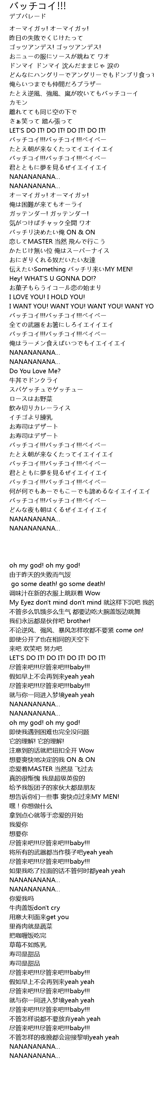 | [00:53.180] | バッチコイ!!!バッチコイ!!!ベイベー |