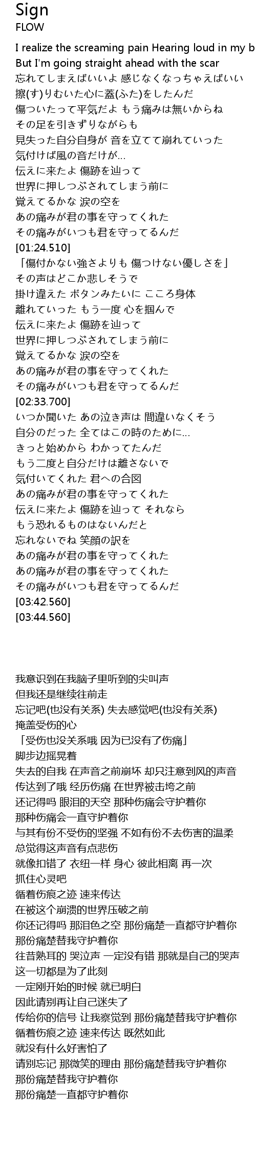 | [02:59.790] | 気付いてくれた 君への合図 あの痛みが君の事を守ってくれた |