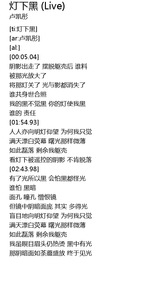 | [01:40.25] | 我的黑不觉黑 你的灯使我黑 |