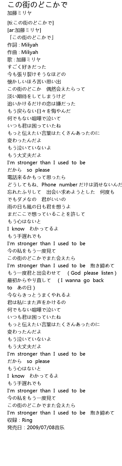 | [03:34.66] | I'm stronger than I used to be 抱き締めて |