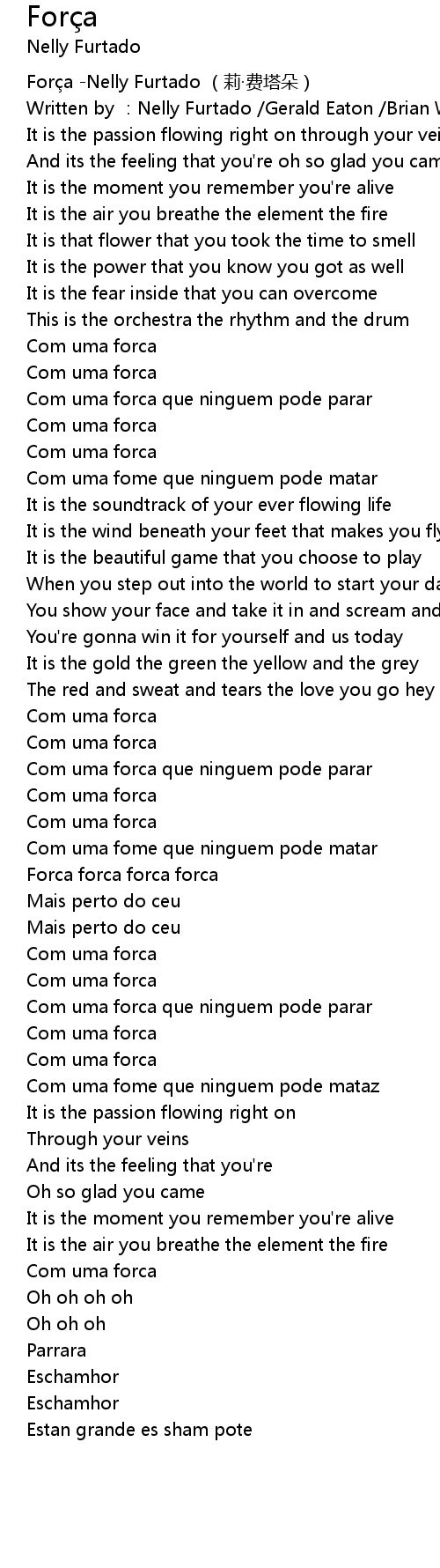 | [00:00.00] | Força -Nelly Furtado (莉·费塔朵) |
