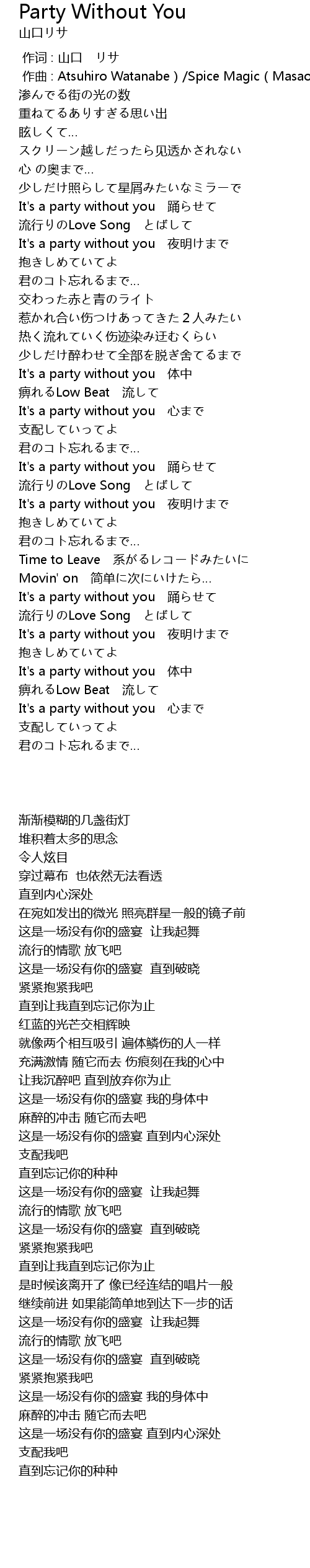 | [02:15.198] | It' s a party without you tǐ zhōng |