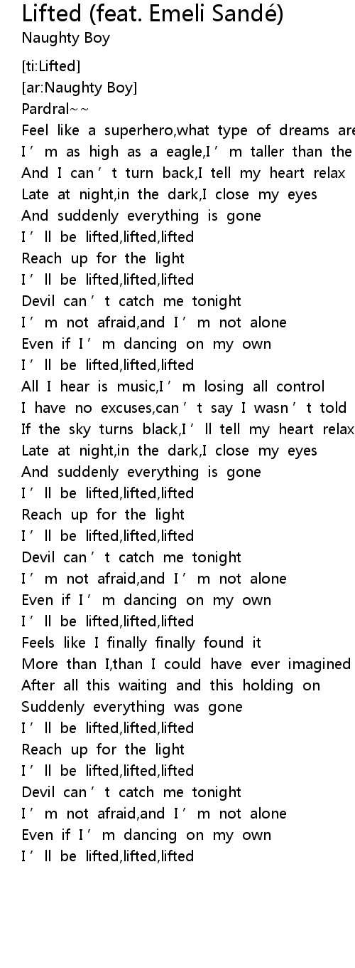 | [01:25.945] | I ' ll be lifted, lifted, lifted |