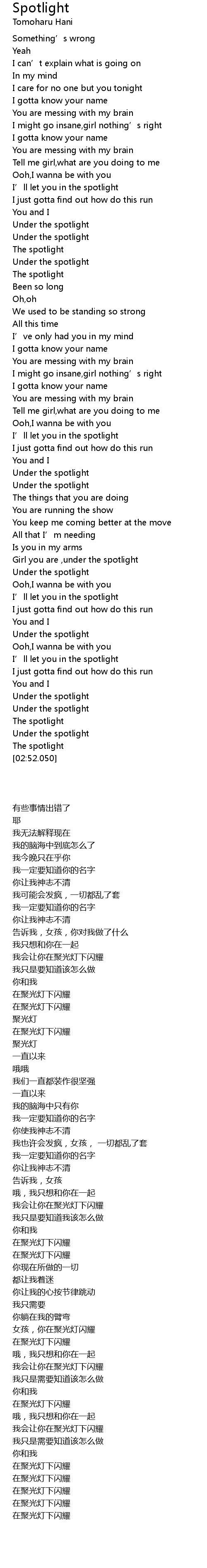 | [01:54.220] | Girl you are ,under the spotlight |