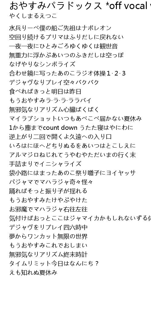 | [02:52.791] | 気付けばおっとここはジャマイカかもしれないずる休み |