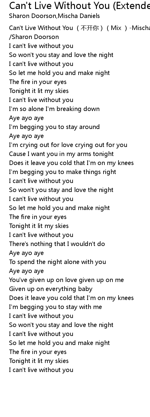 | [00:00.00] | Can' t Live Without You bù kāi nǐ Mix Mischa Daniels Sharon Doorson |
