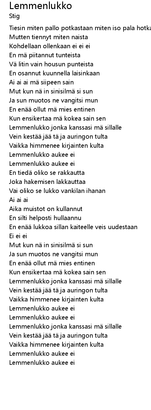| [02:06.96] | Lemmenlukko jonka kanssasi m sillalle |