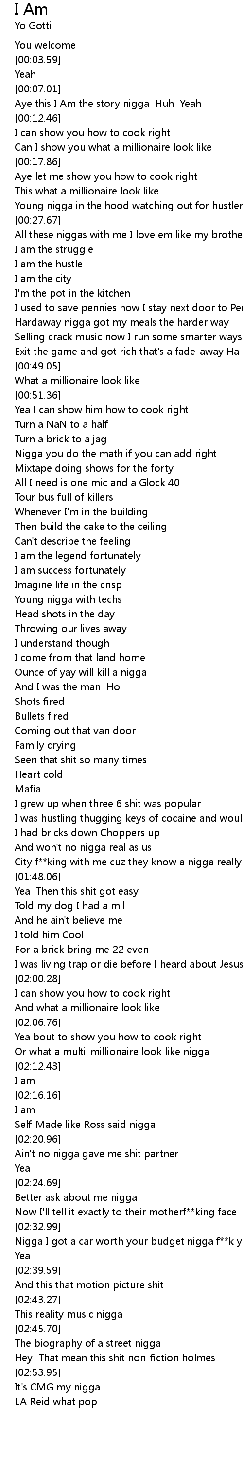 | [00:08.04] | Aye this I Am the story nigga Huh Yeah |