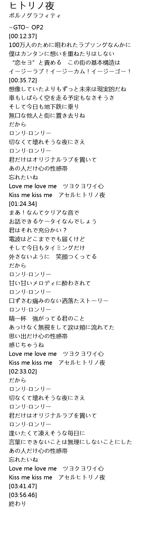 | [03:37.41] | Kiss me kiss me アセルヒトリノ夜 |