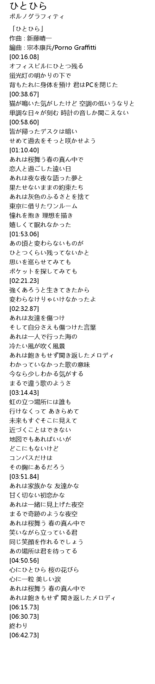 | [05:14.57] | 心にひとひら 桜の花びら |